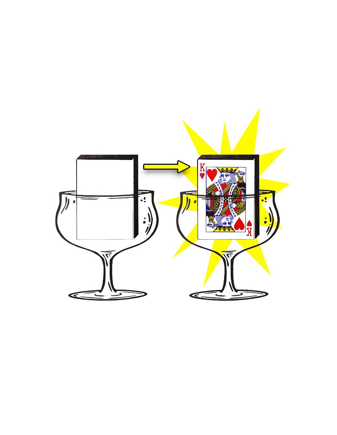 Uno degli spettatori sceglie una carta da un mazzo di carte. Il mago mostra un cartoncino raffigurante il disegno di un bicchiere a calice che contiene un mazzo di carte bianche. Il mago colpisce il cartoncino che, magicamente, mostrerà ora la carta scelta nel bicchiere disegnato!