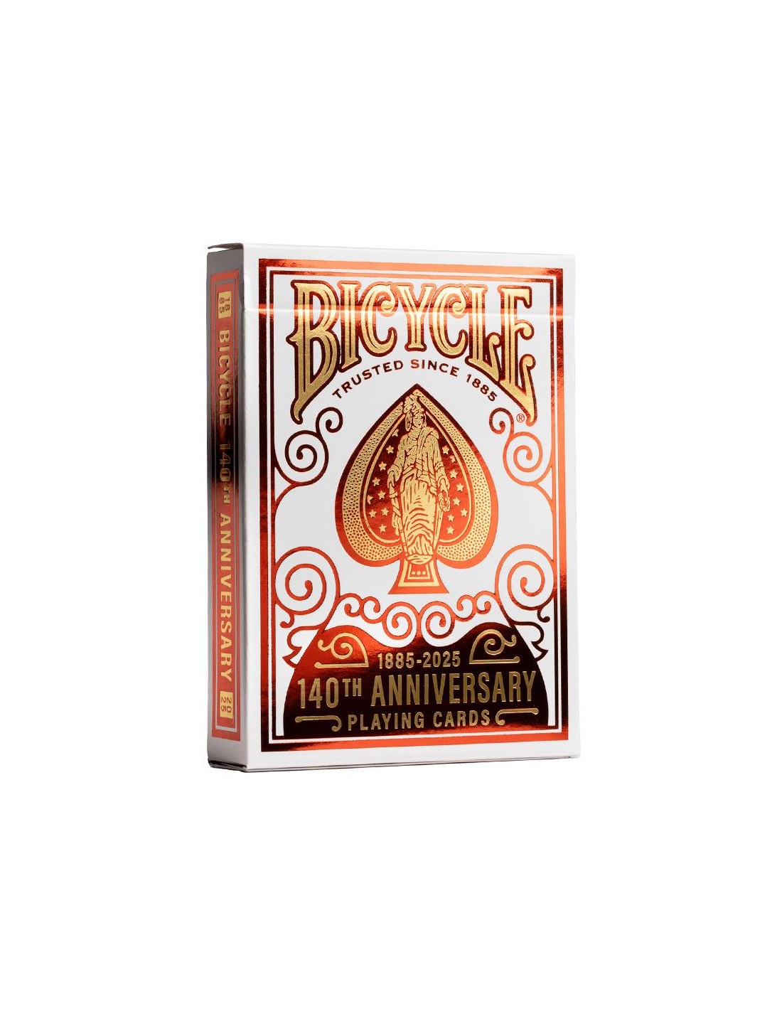 La United States Playing Card Company è orgogliosa di presentare le sue carte da gioco Bicycle 140th Anniversary. Per celebrare la sua leggendaria tradizione, ha unito lo stile classico alla tecnologia moderna. Il bellissimo Gold Metalluxe brilla sia sull'astuccio che sul dorso delle carte, mentre le storiche facce delle carte evocano un nostalgico tuffo nel passato.
