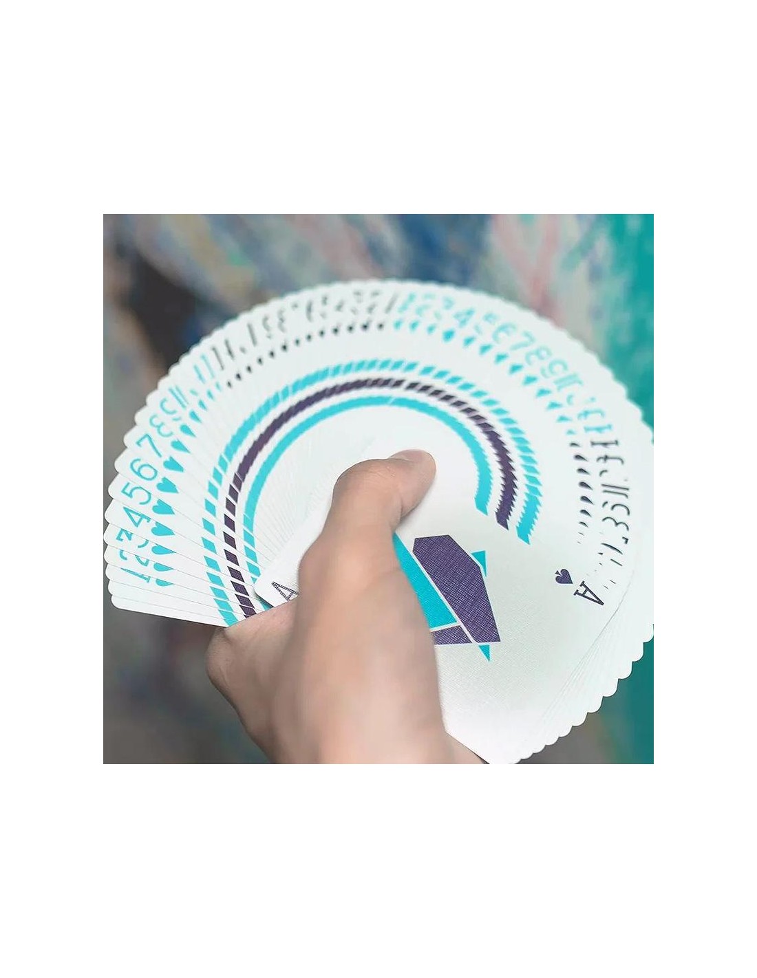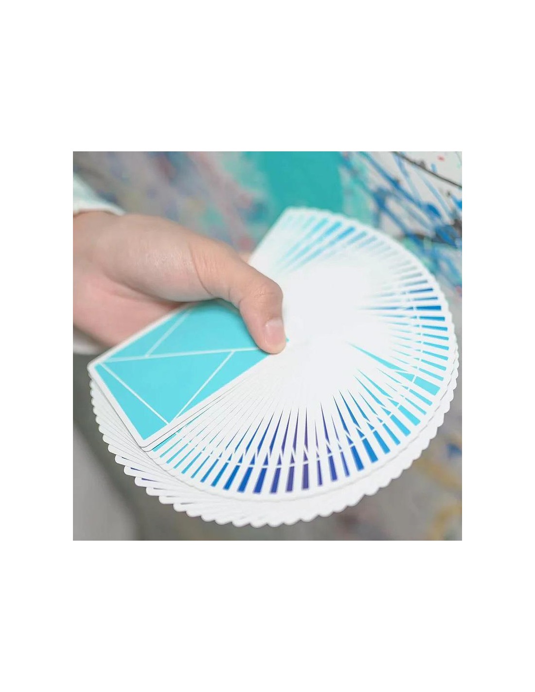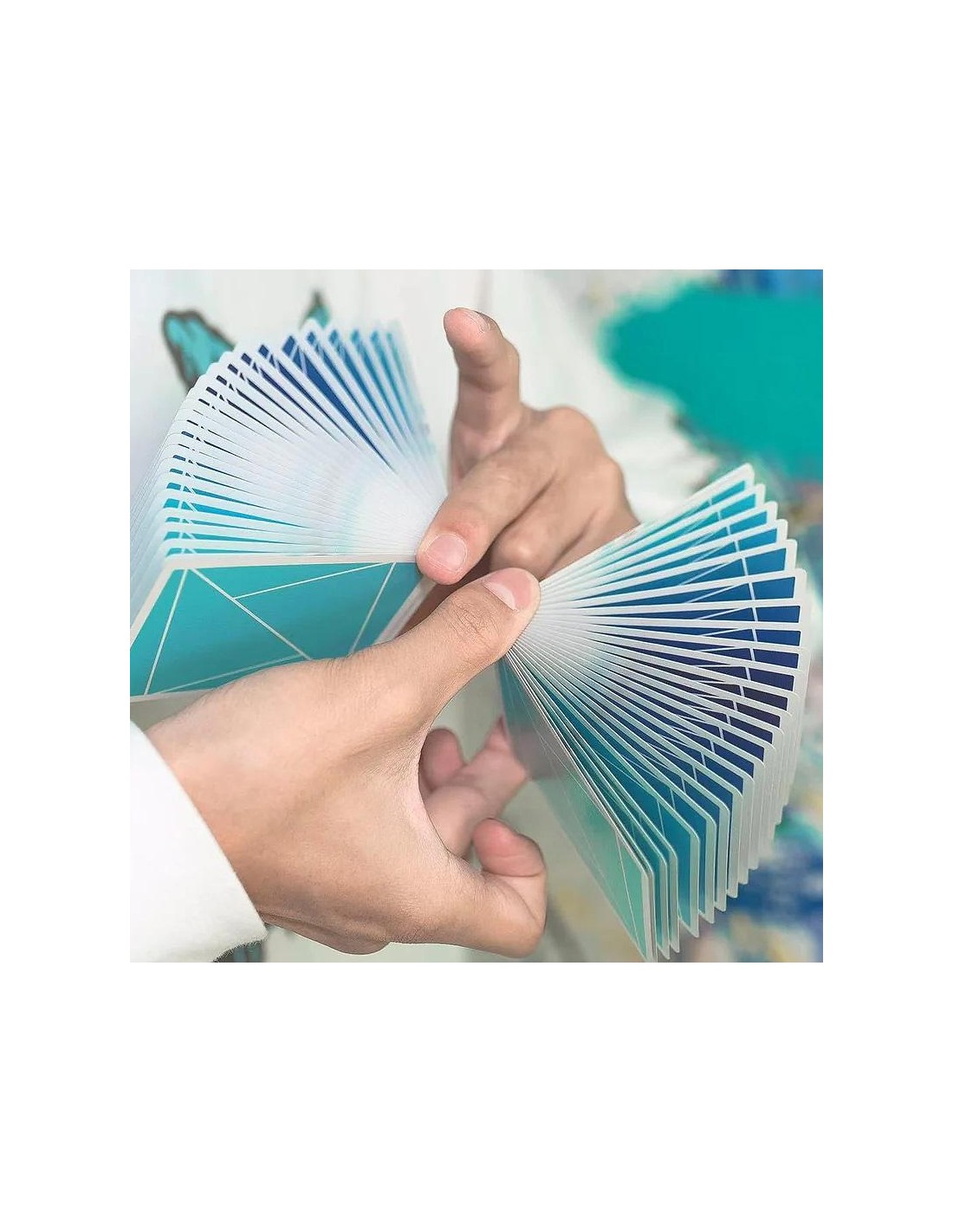 Il colore del dorso delle carte sfuma dal chiaro allo scuro, offrendo un'esperienza visivamente piacevole durante le sessioni di pratica. Si parte dal fresco e vivace verde menta, passando per il vivido azzurro cielo e il puro blu fiordaliso... per concludere con il profondo blu notte. Le sfumature analoghe di blu e verde si distribuiscono armoniosamente sui dorsi delle carte.