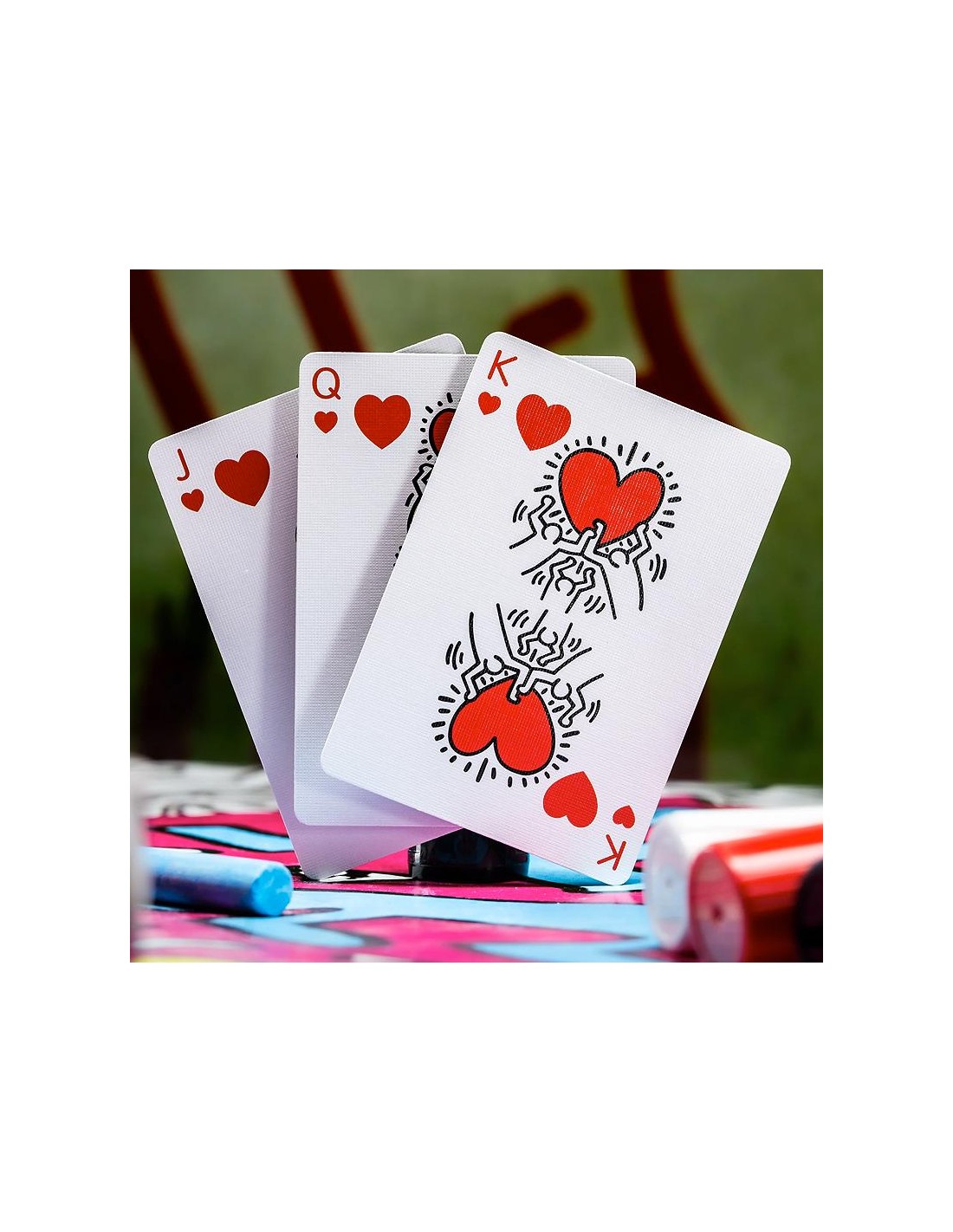 Entrate nel vibrante mondo dell'iconico artista Keith Haring con carte da gioco premium che mettono in risalto la sua pop art contemporanea.