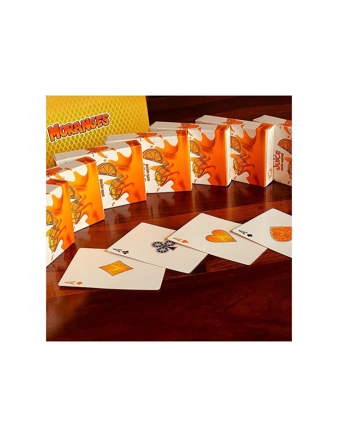 Un giocoso mazzo a tema frutta vibrante che unisce colori e disegni di mango e arance, con personalizzazione di facce e figure. E' un mazzo pensato per gli amanti del cardistry, della magia, del design, delle carte da gioco così come per le persone che amano giocare a carte.