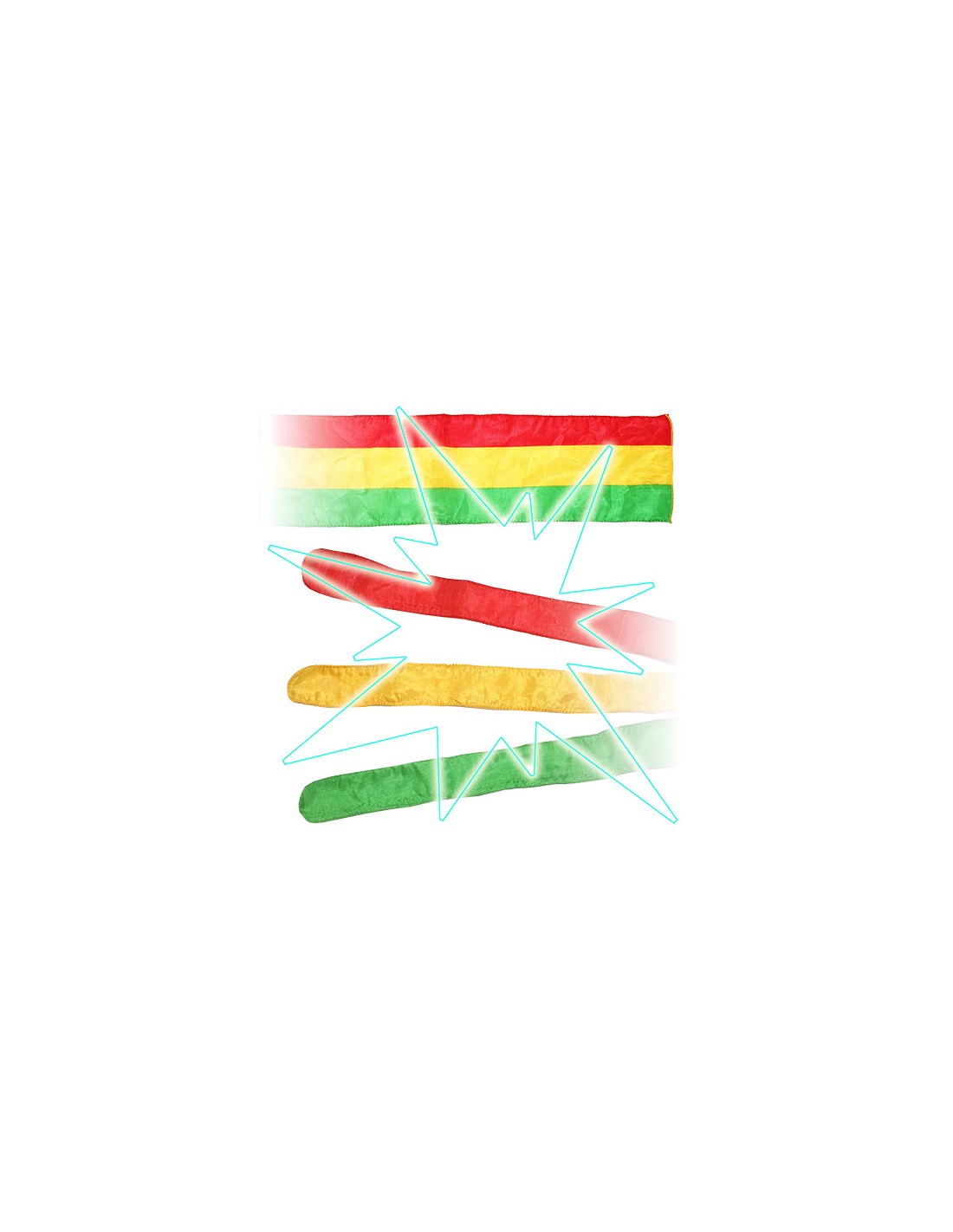 Il mago mostra una striscia di seta formata da tre colori: rosso, giallo e verde. La inserisce nel pugno e magicamente scompone i tre colori: ora, infatti, estrae dal pugno tre nastrini di seta separati e di colore differente. Per finire li rimette nel pugno, apre la mano e mostra di nuovo la striscia ricomposta!