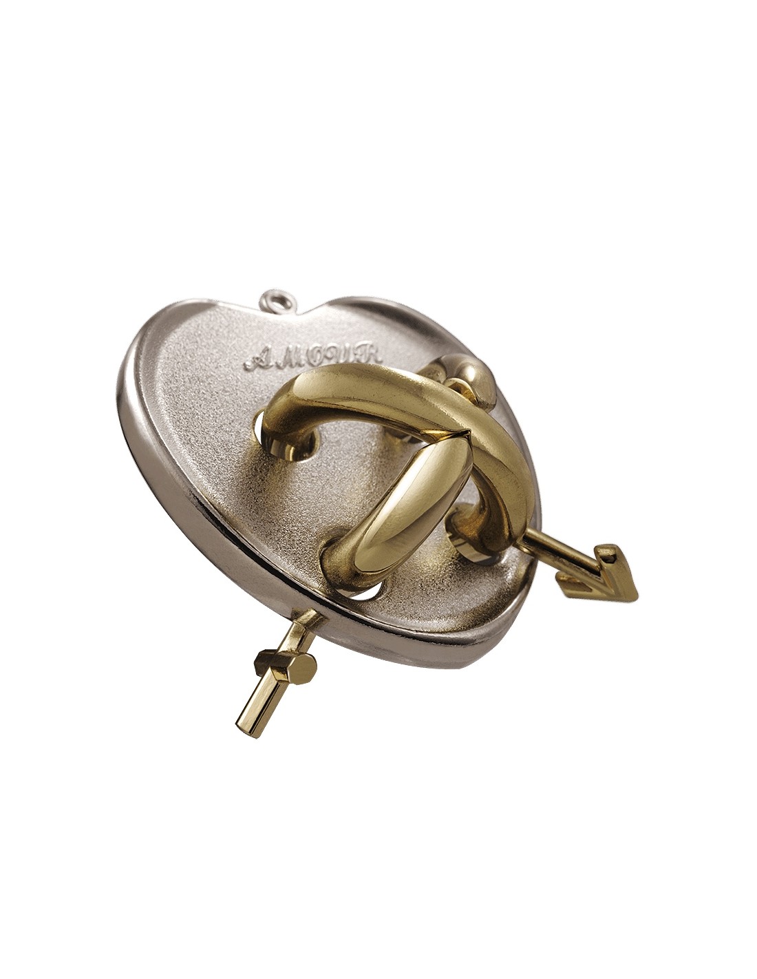Un capolavoro del fabbro Akio Yamamoto, la parola chiave di questo puzzle è “amore”. I due anelli separati collegati dalla placca rendono questo puzzle estremamente arduo. L’obiettivo è di separare gli anelli “Adamo” ed “Eva”, magistralmente uniti dalla placca di metallo a forma di “frutto proibito”…se poi riuscirete a riunirli, potreste anche trovare l’amore.