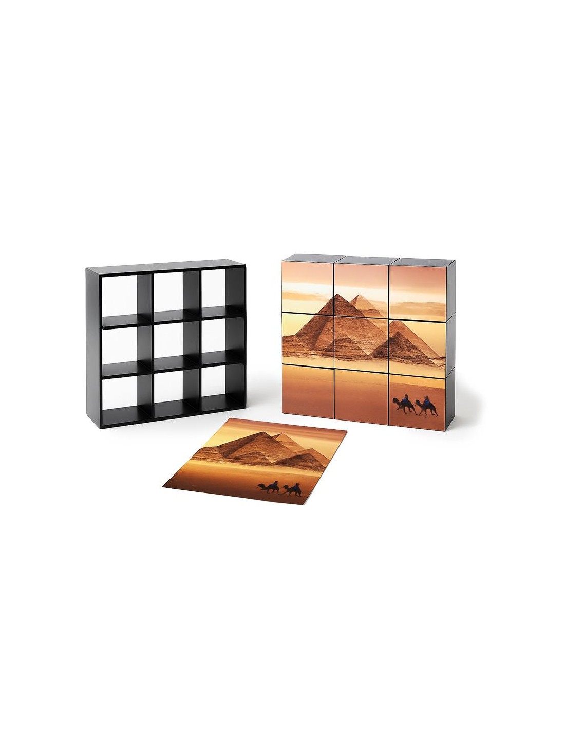 Iniziate la vostra performance mostrando 9 cubi con foto stampate, 6 immagini e una cornice vuota. Mescolate i cubi e fate scegliere ad uno spettatore un'immagine. Quindi, disponete i cubi nella cornice seguendo le indicazioni dello spettatore. Per finire mostrate l'immagine scelta e girate la cornice… magicamente l'immagine composta con i cubi nella cornice è esattamente la stessa di quella scelta!