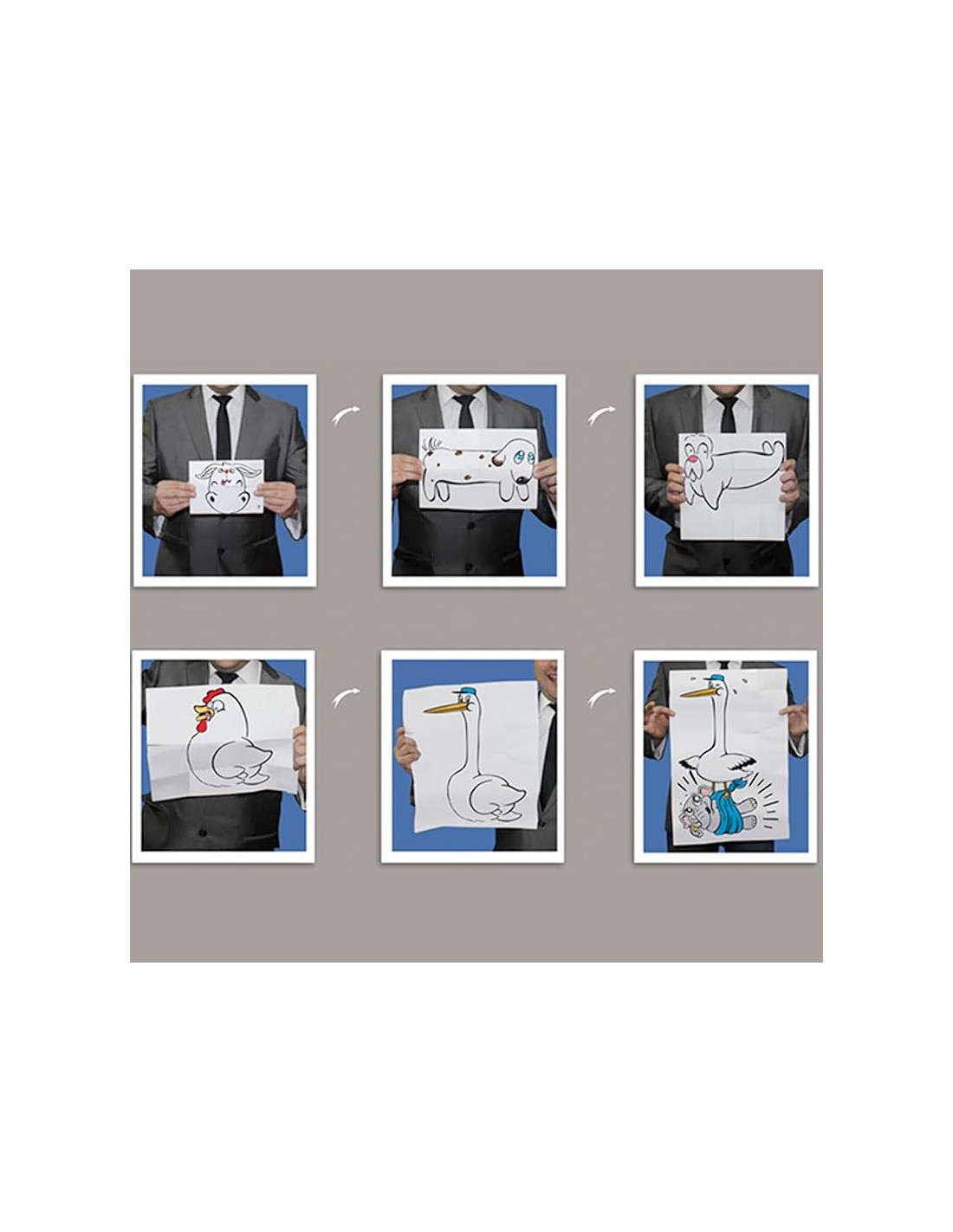 Ogni volta che si apre il foglio, questo diventa più grande e l'illustrazione cambia magicamente. Il pubblico vedrà il coniglio trasformarsi in un cagnolino, che si allungherà fino a diventare un bassotto, che si trasformerà in una foca, poi in un pollo e infine in una cicogna.