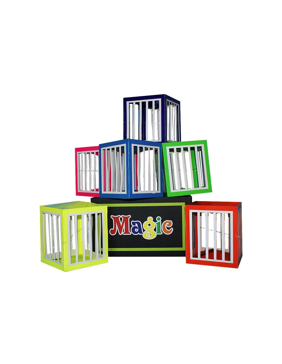 Un attimo dopo produce tre gabbiette colorate.Mostra nuovamente l'interno vuoto del contenitore e, per finire, produce altre tre gabbiette di colori diversi.