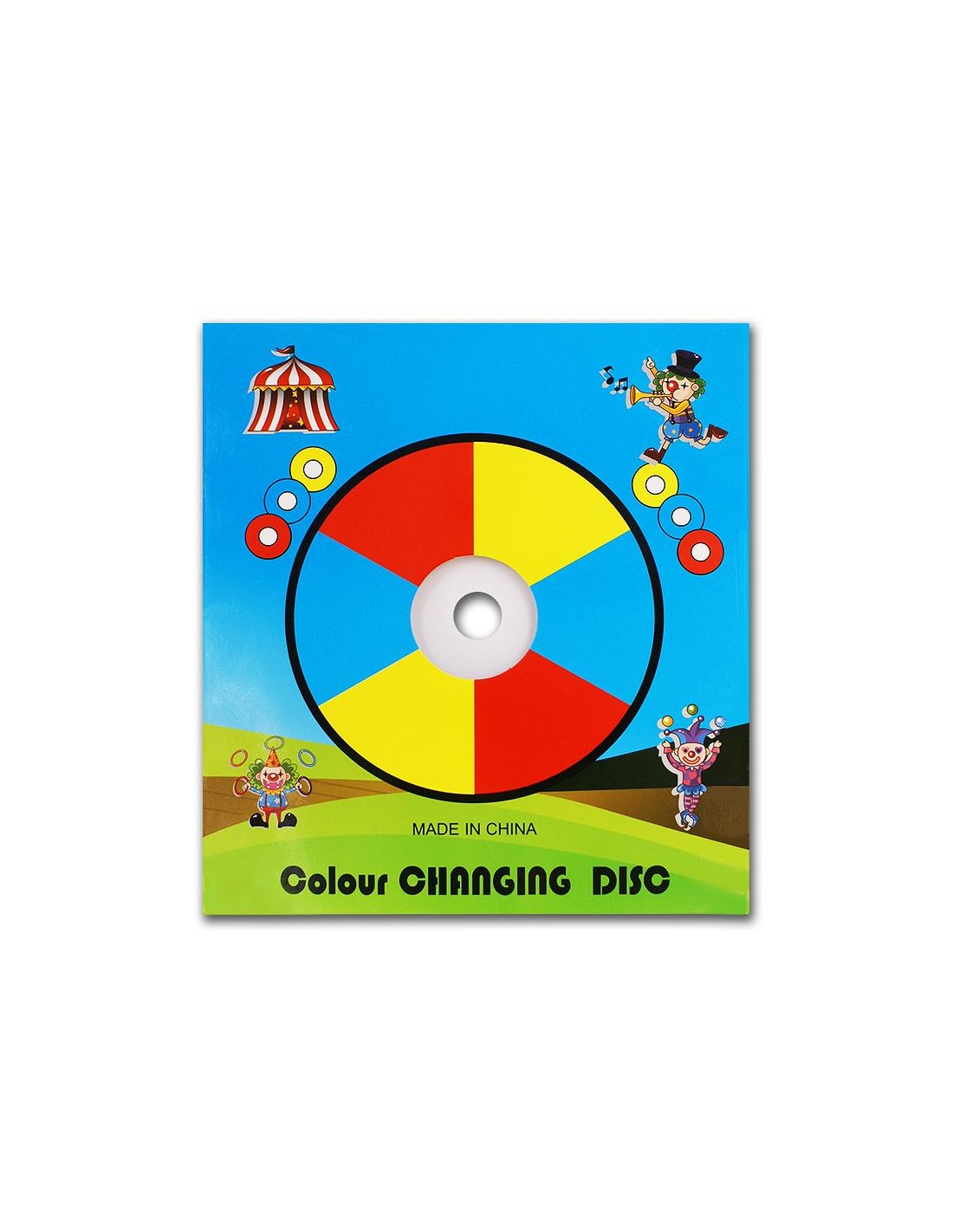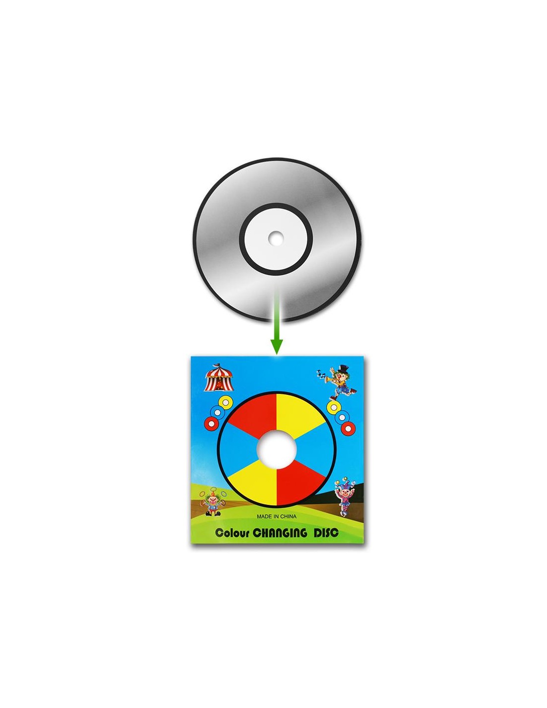 Il mago presenta tre dischi di colore grigiastro. Parte la musica e un disco viene messo in una custodia. Un nastro rosso viene fatto passare attraverso il foro presente sulla stessa e, dopo un gesto magico, il disco verrà estratto dalla custodia: ora sarà rosso su entrambe le facce! Subito dopo la custodia verrà mostrata vuota. Il tutto viene ripetuto con gli altri due dischi che diverranno uno totalmente giallo e l’altro totalmente azzurro!
