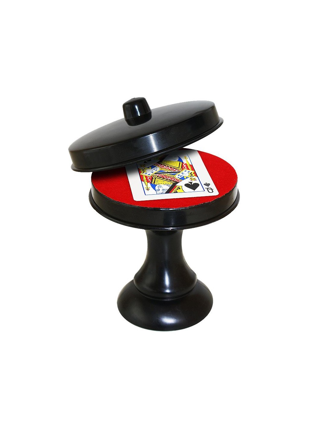 Il prestigiatore fa scegliere una carta ad una persona del pubblico, la fa rimettere dentro al mazzo e poi lo consegna per farlo mescolare. Ripreso il mazzo, il prestigiatore prende una carta affermando che quella è la carta scelta in precedenza. Una volta ricevuta la risposta negativa da parte dello spettatore, il performer appoggia la carta su di un elegante piedistallo, chiude il tutto e dopo aver schioccato le dita invita lo spettatore a riaprire il coperchio. Il pubblico rimarrà stupito nel constatare che la carta mostrata in precedenza si è trasformata nella carta scelta dallo spettatore. Un attrezzo dalle mille risorse...