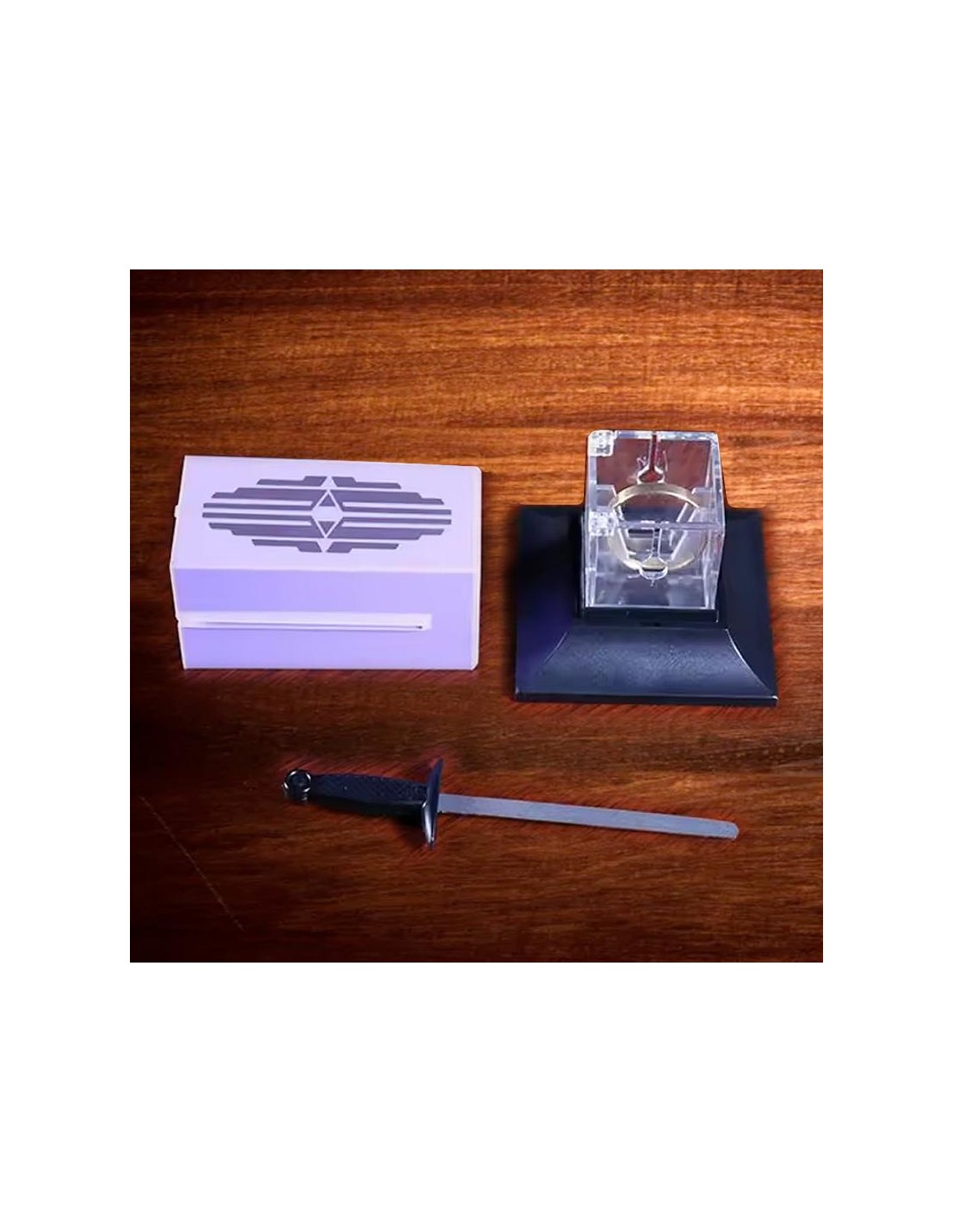 Il mago mostra una scatolina trasparente. La apre e ci inserisce dentro un anello (volendo preso in prestito). Appoggia il tutto su un piedistallo e copre ogni cosa con un parallelepipedo. Quindi, mostra una piccola spada che inserisce nelle fessure laterali del parallelepipedo e la spinge in basso fino al piedistallo. Per finire rimuove il parallelepipedo e si vedrà che la spada ha trapassato la scatolina e l'anello. Infatti, quest'ultimo verrà estratto dalla scatolina "infilzato" nella spada!