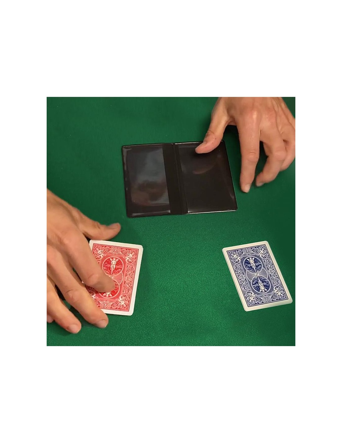 Continua voltando a dorso in alto questi due Re che, come secondo colpo di scena, mostreranno il colore del dorso diverso dal mazzetto di appartenenza: tra le carte con i dorsi rossi il Re avrà il dorso blu e viceversa!